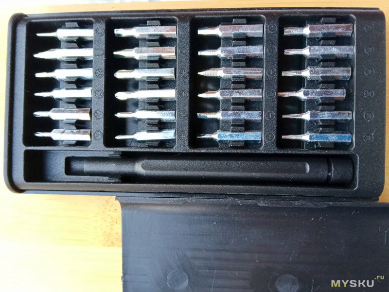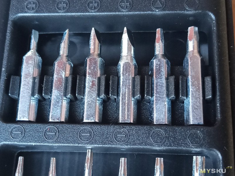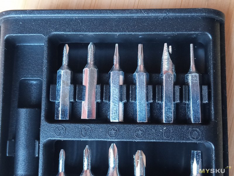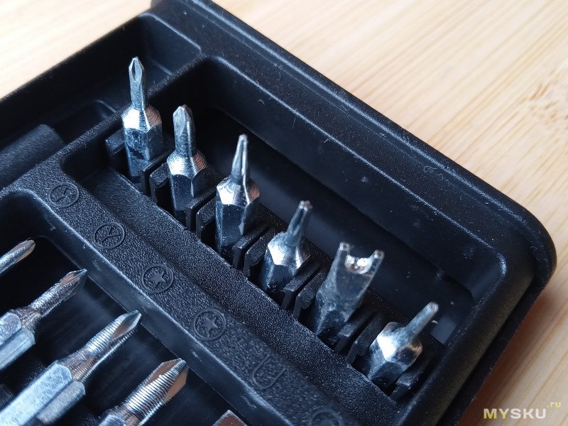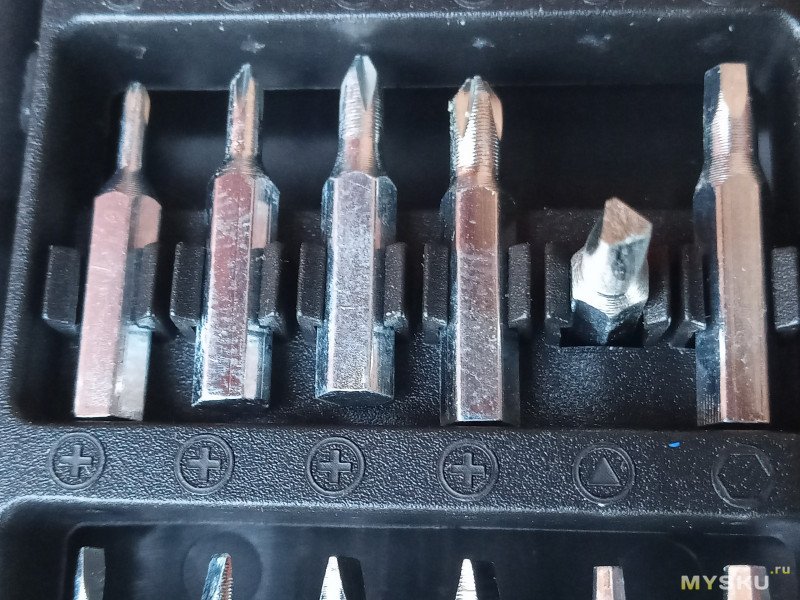 Важно — после нескольких доставаний бит из своих защёлок, те перестают их держать (как выше писал — они из дурного пластика, который не гнётся и видимо деформируется).Под каждым рядом обозначения бит, но пластик… Мало того, что он тактильно неприятен, читается так же тяжело, не видно эти значки под настольной лампой (фото для обзора делал на балконе):