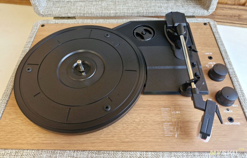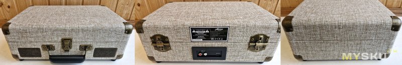 Крышка (внутри та же ткань) закрывается на защелку, если «вертушкой» не пользоваться, так он занимает меньше места и защищает звукосниматель от пыли. Открывается на 90+ градусов.Снизу резиновые опоры: