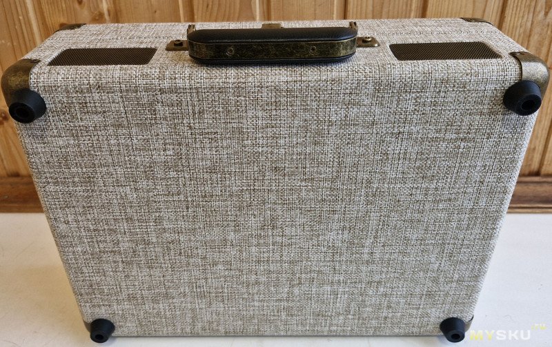 Рассмотрим корпус проигрывателя. Ткань с крупной текстурой, динамики выведены вперед, и размещаются под металлическими сетками размерами 6х4 см. Углы с защитой, вся металлическая фурнитура покрашена под бронзу.