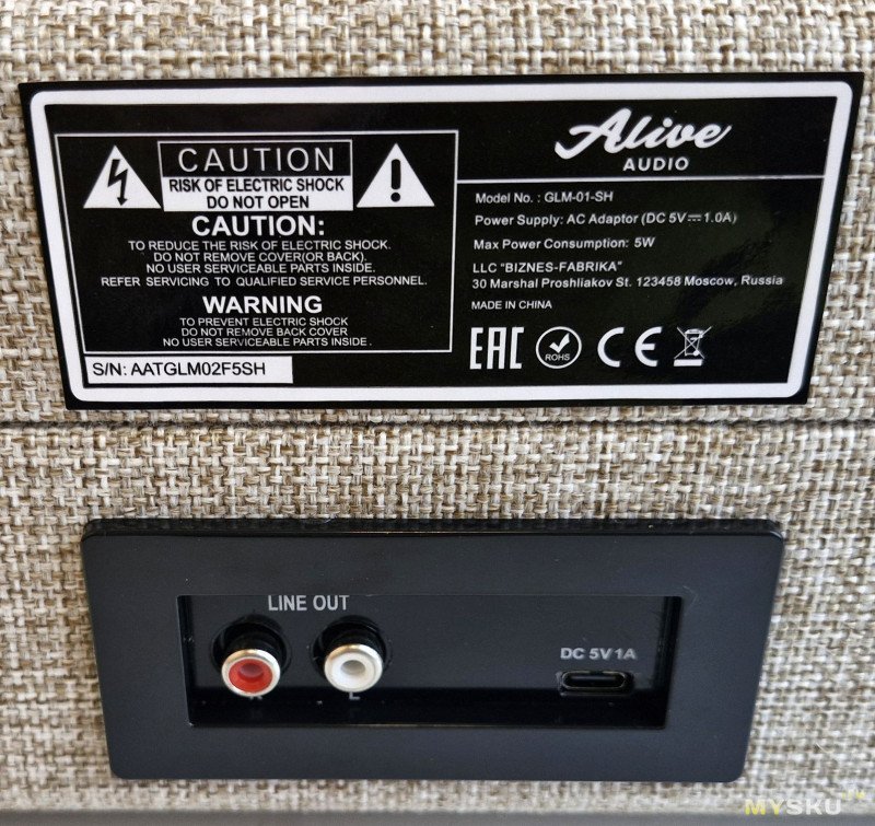 На задней части размещаются разъемы: питания и RCA на внешний усилитель/активные колонки. Там же информационная наклейка производителя.