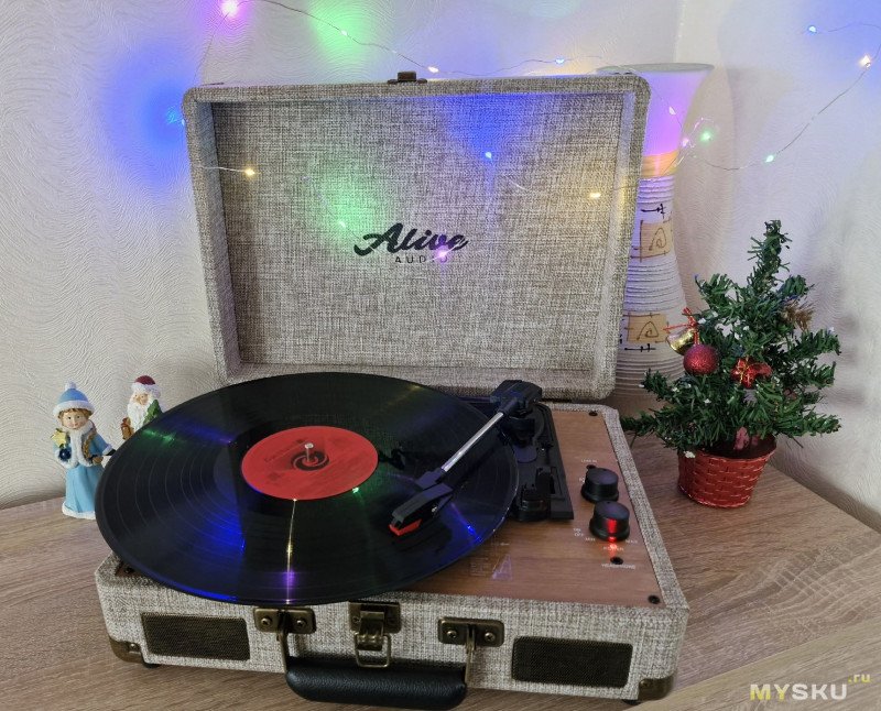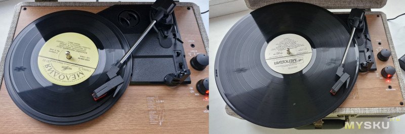 Пластинки (причем и полноразмерные) крутятся и воспроизводятся, звук в голосовом диапазоне четкий. Полноценной стерео базы нет по понятным причинам.