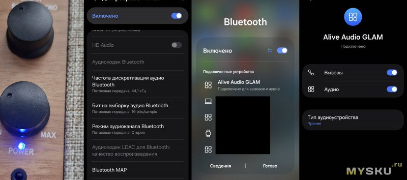 Имеется линейный вход (для ПК или плеера) 3,5 мм есть, беспроводной протокол Bluetooth 5.0 и проводные наушники можно подключить. Одна ручка управляет включением и громкостью, вторая входами сигнала. Есть индикатор режима.