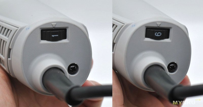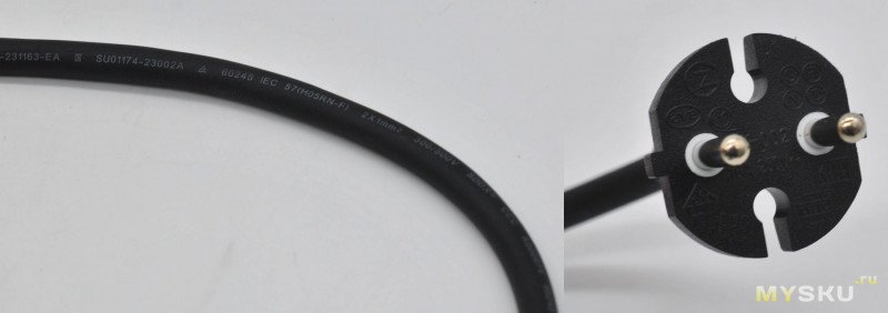 Сетевой шнур очень длинный (3 м!), в меру гибкий (внутри 2х1 мм2), заканчивается вилкой без заземления на 16 А. От перегибания шнур защищен гибкой втулкой из материала ПВХ.