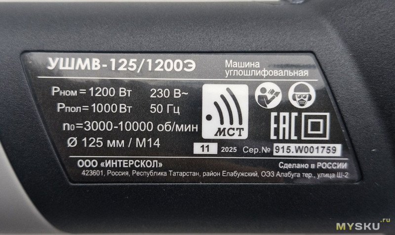 У Интерскол УШМВ-125/1200Э сразу отмечаем систему плавного пуска (без рывка) и не высокий шум (среди УШМ) в районе 93 дБ на расстоянии ~ 1 м.