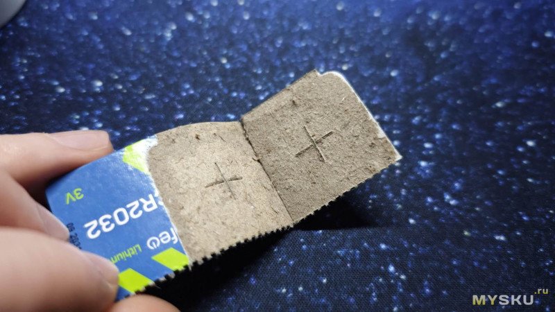 В плане извлечения батарейки это один из самых удобных блистеров, из тех что я видел. Отсек с батарейкой легко и чётко отрывается по линии перфорации, затем достаточно перегнуть его пополам, как он свободно расщепляется на половинки, внутри которых виден крестообразный надрез, через который без труда извлекается батарейка.