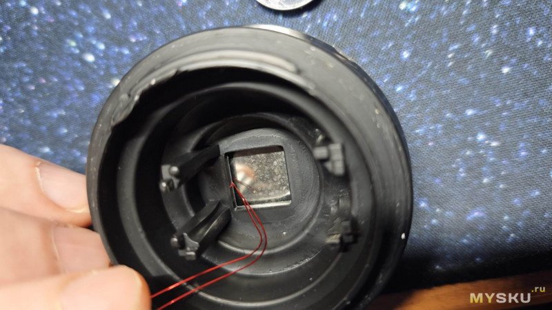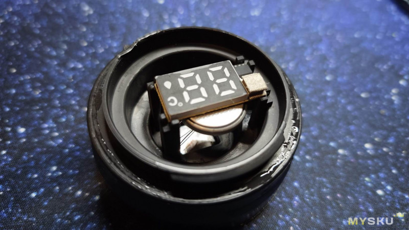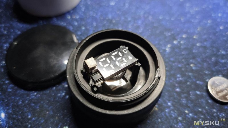 Внутри мы видим двух-сегментное светодиодное табло, под которым прячется батарейка, а снизу проводок термопары, который контактирует с металлической площадкой внизу крышки, замеряя температурные показания содержимого термоса.
