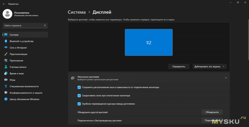 При подключении адаптера к USB Type-C разъему ноутбука с поддержкой вывода изображения система один раз кратковременно «мигает» экраном и автоматически предлагает режим зеркалирования. При этом не имеет значения, какой интерфейс используется для подключения внешнего дисплея — VGA или HDMI, поведение системы остается одинаковым. В настройках можно выбрать вариант автоматического дублирования изображения на всех экранах либо задействовать внешние дисплеи как дополнительные, с возможностью настроить их расположение относительно основного экрана. Однако при одновременном подключении двух мониторов есть ограничение: оба внешних дисплея всегда работают в режиме зеркалирования между собой. Использовать их как два независимых расширенных экрана не получится — функция раздельного расширения здесь, увы, не предусмотрена.