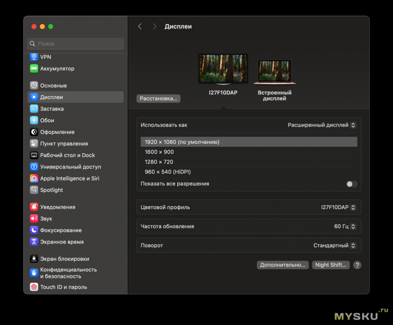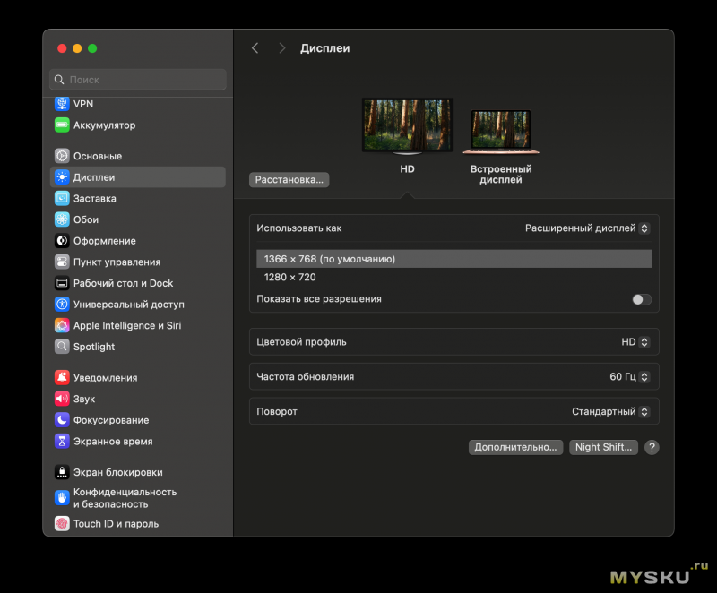 При одновременном подключении двух внешних дисплеев macOS корректно определяет оба монитора, однако по умолчанию запускает их в режиме зеркалирования — оба экрана выводят одинаковое изображение, работая как дополнение к основному дисплею. В таком сценарии система позволяет задать общее разрешение сразу для двух мониторов, но без возможности тонкой настройки параметров для каждого из них отдельно. Если же подключать экраны по одному, macOS предоставляет больше свободы: можно индивидуально настроить разрешение, цветовой профиль и выбрать режим работы — дублирование основного экрана либо расширение рабочего пространства.