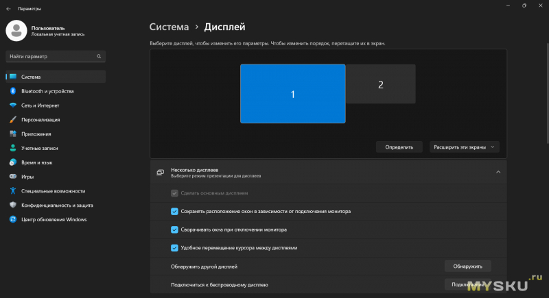 При одновременном подключении двух внешних дисплеев macOS корректно определяет оба монитора, однако по умолчанию запускает их в режиме зеркалирования — оба экрана выводят одинаковое изображение, работая как дополнение к основному дисплею. В таком сценарии система позволяет задать общее разрешение сразу для двух мониторов, но без возможности тонкой настройки параметров для каждого из них отдельно. Если же подключать экраны по одному, macOS предоставляет больше свободы: можно индивидуально настроить разрешение, цветовой профиль и выбрать режим работы — дублирование основного экрана либо расширение рабочего пространства.Подключение к Windows