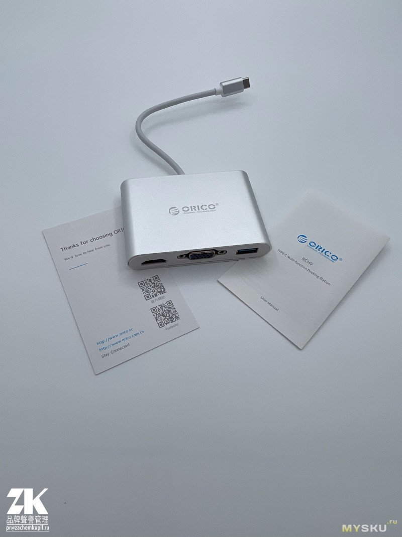 Комплект поставки у ORICO RCHV предельно минималистичный (я бы даже сказал бедный) и без лишних изысков. В коробке пользователь найдет сам док-адаптер, гарантийный талон и многоязычную инструкцию по эксплуатации. На этом список содержимого заканчивается. Никаких дополнительных аксессуаров в комплект не положили: кабелей HDMI, VGA или USB здесь нет, и рассчитывать на них не стоит. С одной стороны, подход вполне ожидаемый для подобного класса устройств, с другой хотелось бы хотя бы получить чехольчик (например, как у UGREEN). Поэтому при покупке стоит заранее убедиться, что все необходимые кабели у вас уже есть, иначе к стоимости адаптера придется добавить ещё и покупку подходящих проводов.