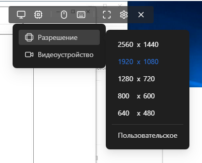 В тулбаре можно выбрать разрешение локального окна и устройство ввода. На ноуте там доступна ещё и вебкамера.