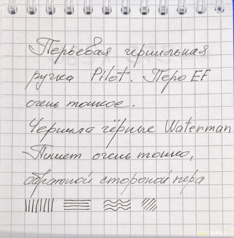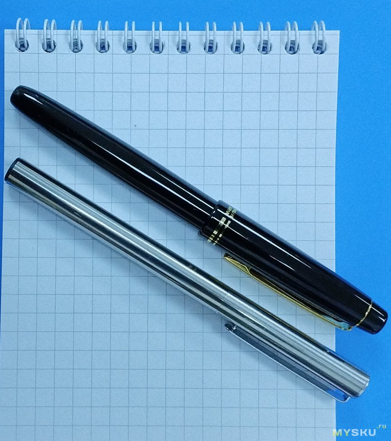 Пишет ручка отлично. Ровная подача чернил, без пропусков, тонкая четкая линия. Кстати, именно я поэтому и заправил ручку черными чернилами Waterman. Чтобы на бумаге иметь тонкую, черную линию.