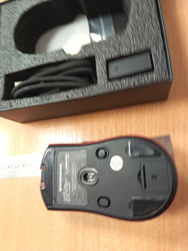 Передатчик и аккумулятор. До этого беспроводными мышами не пользовался, думал что задержки будут. По факту задержек не заметно. В софтине мыши можно менять частоту опроса. Чаще опрос — меньше срок работы на аккумуляторе. Поставил около 3000. Хватает на два-три дня. После этого надо втыкать провод в USB разъём на мышке. А вот провод здесь очень жёсткий. Учитывая лёгкость мыши он создаёт некоторое сопротивление. Вторая проблема с кабелем что при подключении через USB контакт не всегда стабильный. Может определяться и пропадать при включении, пиликание винды что обнаружено устройство сигнализирует что устройство найдено. Особый прикол в таркове, при включении кабеля в центре останется курсор винды. Лечится только перезагрузкой. Впрочем после фиксирования кабеля сигнал уже не пропадает. Зарядка примерно полтора часа. В беспроводном режиме мышь переходит в спящий режим. Выходит из спячки без задержки.