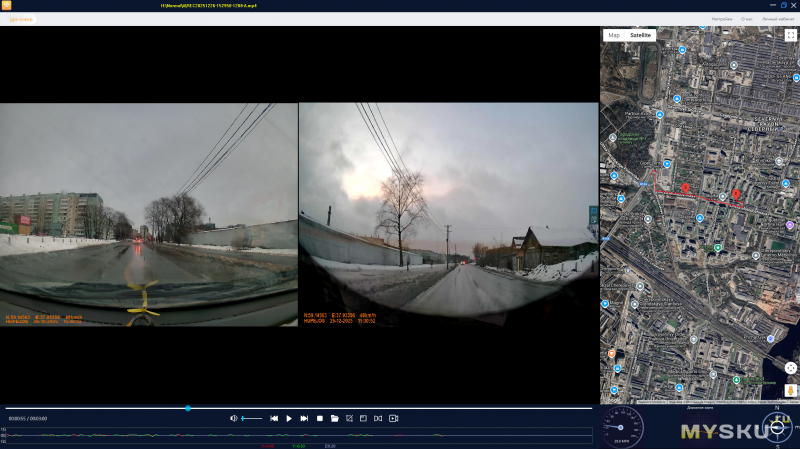 Для просмотра отснятого видео материала можно использовать программу на компьютере GXPlayer, которая умеет извлекать из кадра геотрек и накладывать на карту. Или использовать приложение для смартфона TsCam, предварительно подключившись к регистратору по wi-fi (пароль 12345678). Есть версия как под iOS так и android.Оптика работает хорошо, картинка довольно чёткая и разборчивая. Последние дни погода на улице очень сырая и пасмурная, но регистратор вроде с задачей справляется. Из недостатков я бы отметил то что он как и мой предыдущий регистратор, ловит блики на стекле. Надо будет поиграться с размещением возможно удастся их убрать. Но что мне очень не понравилось, так это звук. Запись голоса ужасен, регистратору явно не хватает шумоподавления.