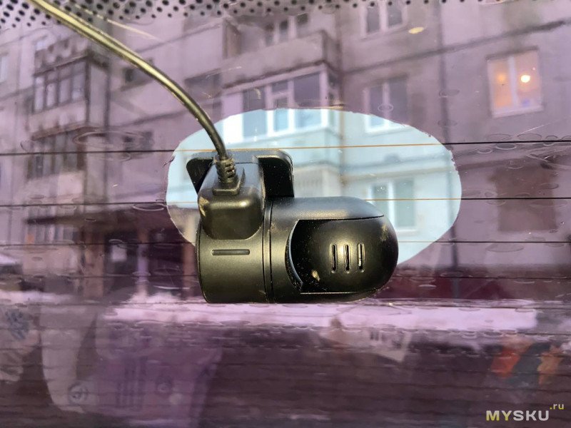 Задняя камера — крепление и проводкаКамера — компактная, с углом обзора ~120°, закрепить я решил на двусторонний скотч к самому заднему стеклу, но перед этим сделал вырез в тонировке, для более яркой и качественной записи. Провода достаточно будет, даже если у вас универсал (около 6 метров!), протянул по потолку и там же спрятал остаток провода, потому что машина у меня не на столько длинная и провода осталось прилично. Всё смотал в жгут и идеально уложил его под потолком. Разъём — стандартный jack-подобный, при движении даже по лесной дороге не вываливается из гнезда регистратора.