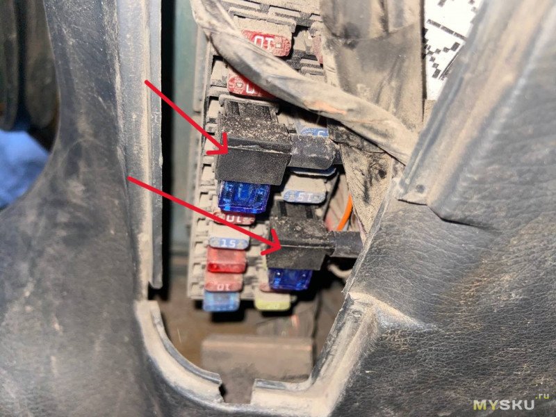 Берем один провод с разъёмом «под предохранитель» → ищем в блоке предохранитель с постоянным плюсом (например, для часов или сигнализации) и втыкаем его в разъём. Сам предохранитель (который был в блоке предохранителей) втыкаем в гнездо на проводе.
