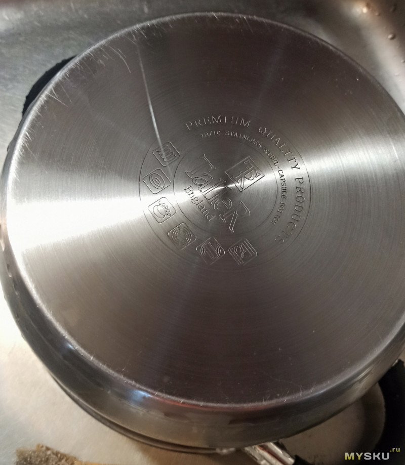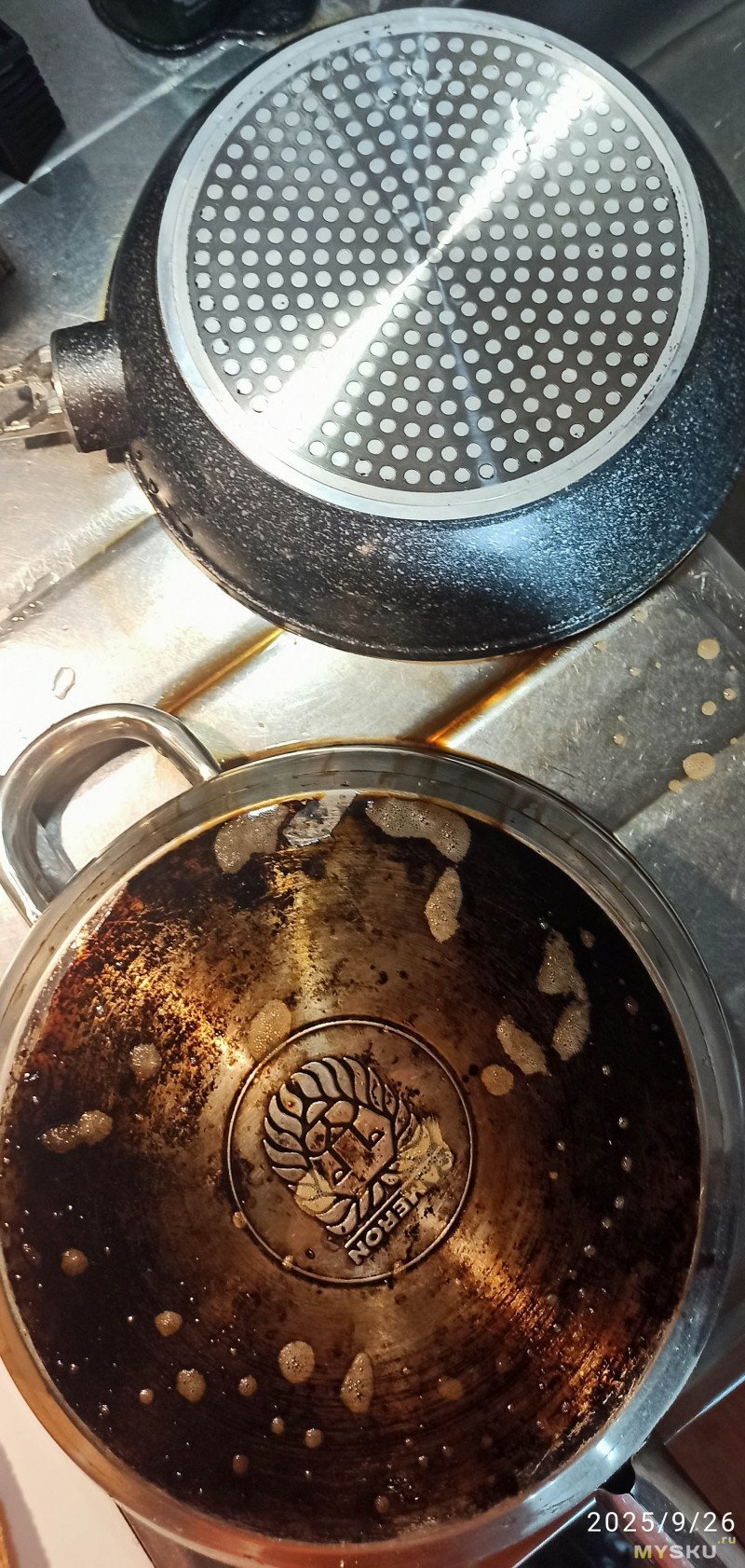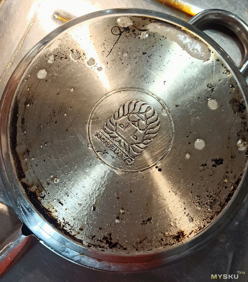 Ну давайте дадим этому чуду еще один шанс, опять повторяем пример из видео — очистку дна посуды. У меня есть вот такая видавшая многое сковородка.