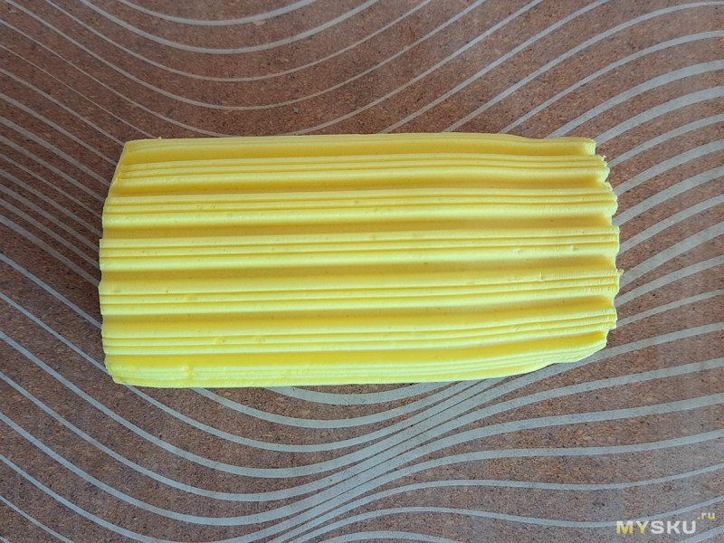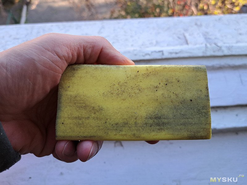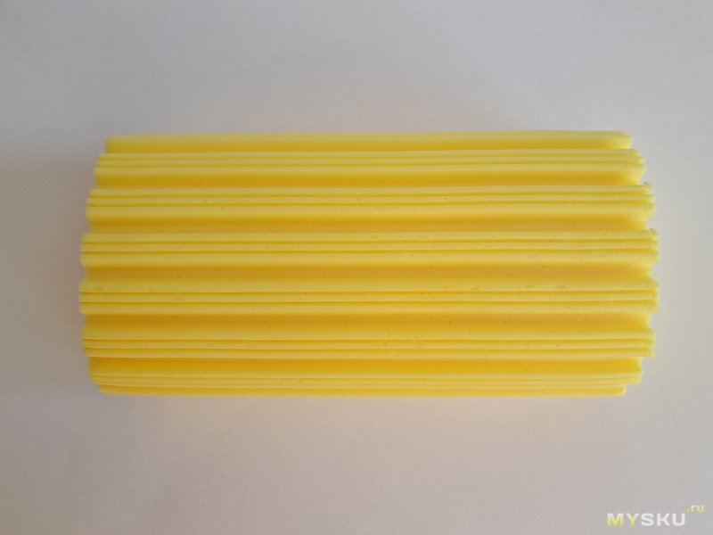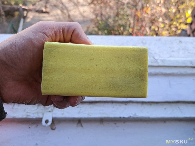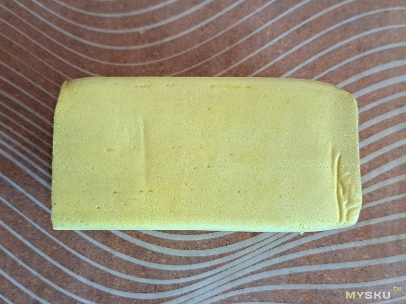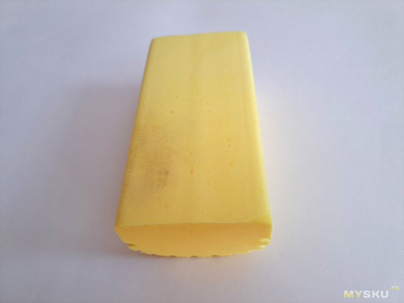 Как видно на торце, губка мелкопористая и больше напоминает вспененную резину или силикон, чем поролон.