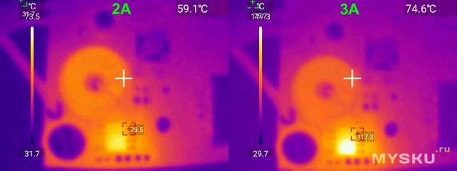 Нагрев при токах 2 и 3А — имс преобразователя ~75 и 120C, дроссель 60 и 75 соответственно: