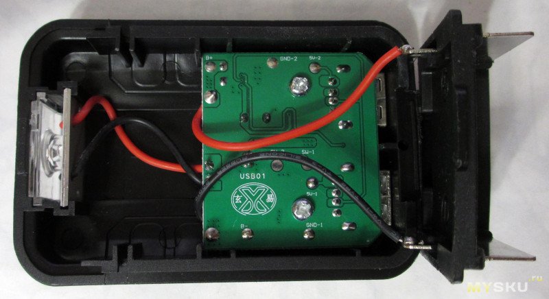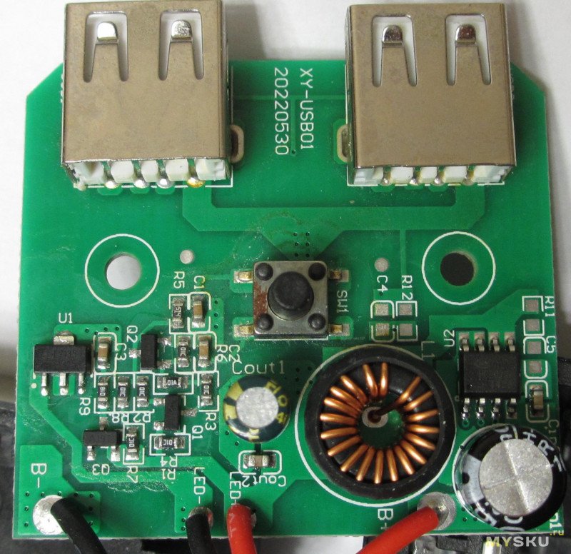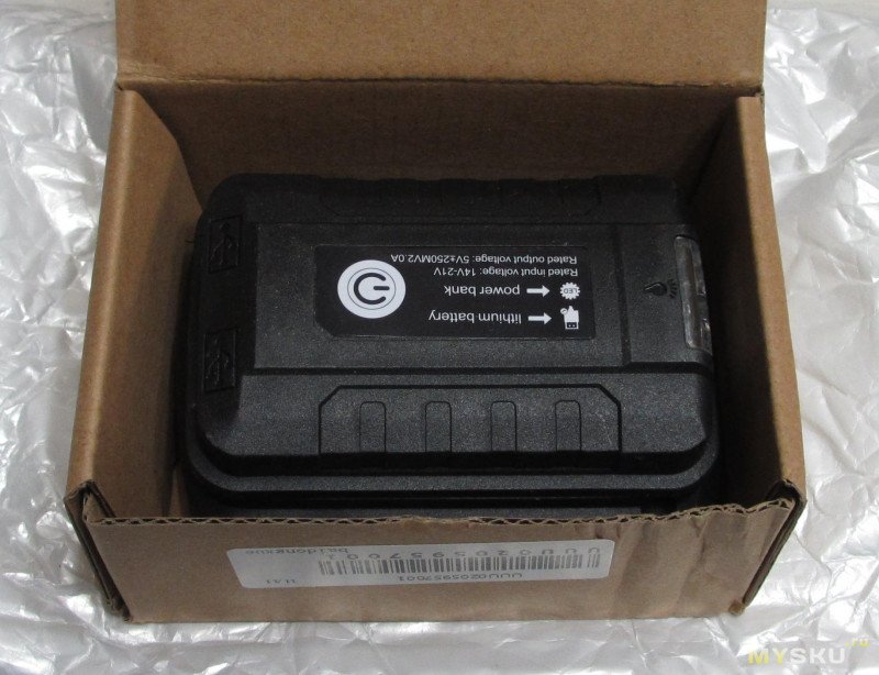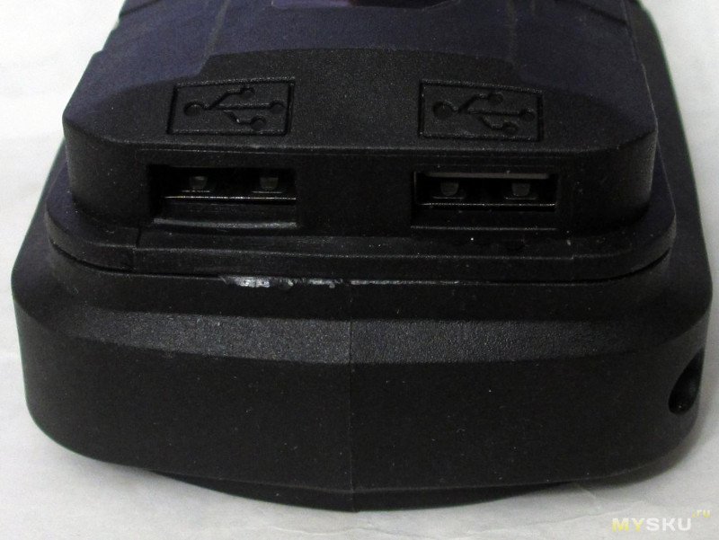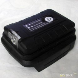 Есть два запараллеленных usb-a, для которых обещаны стандартные 5В 2А и фонарик включаемый кнопкой наверху, кнопка без фиксации, первое нажатие включает, второе выключает.![]() | ![]() |