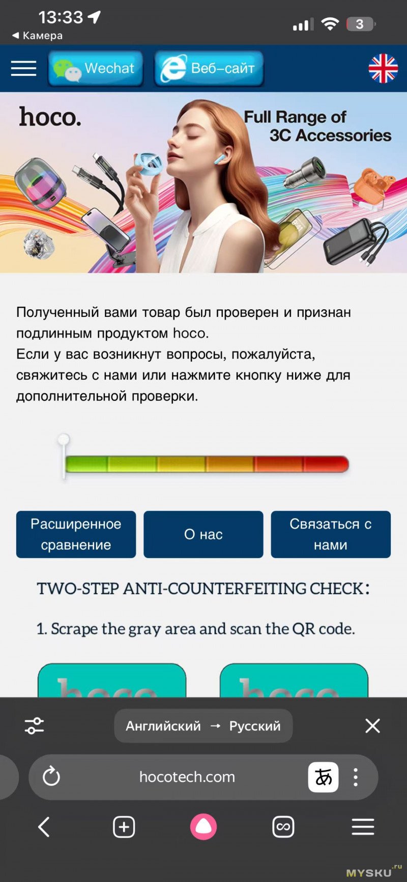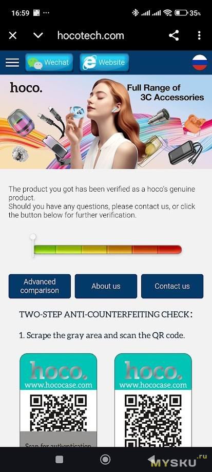 Сканируем QR-код и попадаем на страницу аутентификации. Несмотря на то, что наушники были куплены в официальном магазине бренда на Озон — hoco global, проверка выдала, что мой экземпляр — фейк. Непонятно.