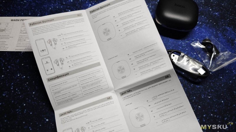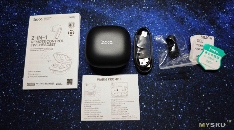 Комплект поставки стандартный. Почти. Зарядный кейс с наушниками, зарядный кабель, 2 пары дополнительных амбушюров, инструкция и пакетик с силикагелем — такого я еще в наборе с наушниками не видел.