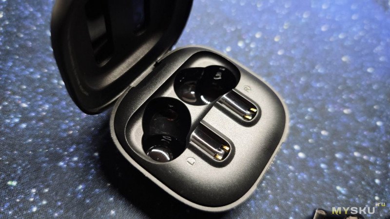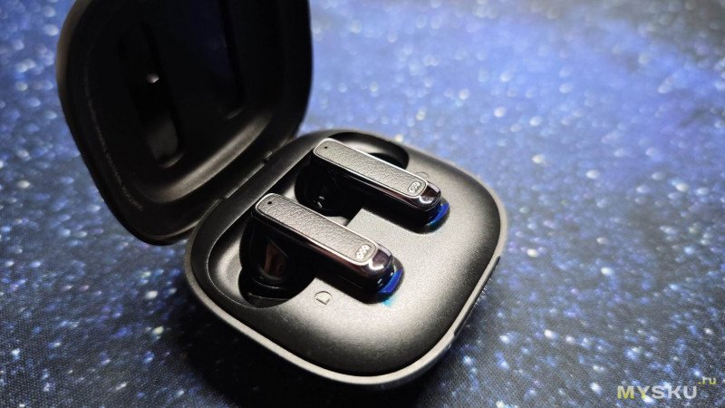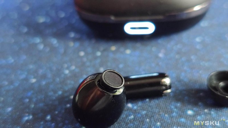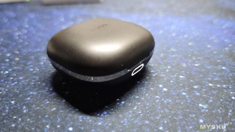 С обратной стороны корпуса в небольшом углублении расположен разъем USB Type-C для подзарядки кейса. Кейс оснащён аккумулятором на 350 мАч, что позволяет полностью зарядить наушники несколько раз.