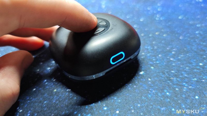 Фишка наушников — управление с помощью кнопок на зарядном кейсе. Чтобы активировать эту функцию, придётся совершить еще одно Bluetooth сопряжение со смартфоном, но теперь уже не наушников, а кейса. Для этого нужно нажать и удерживать центральную кнопку на пульте кейса, пока индикатор не загорится голубым цветом.