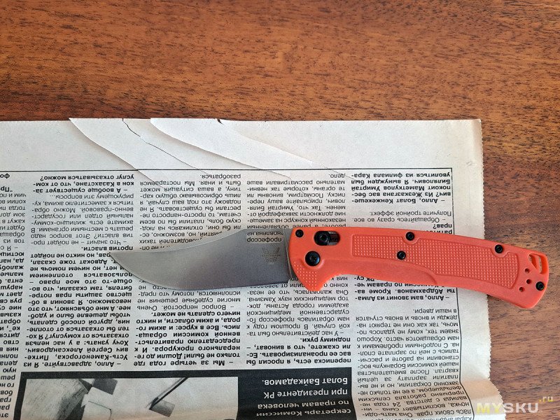Клинок относительно острый: режет газету на весу, но с небольшими надрывами.