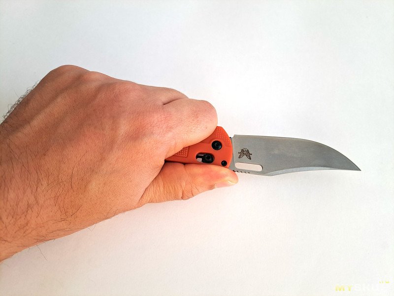 Рукоять не предполагает большое количество вариантов хвата. При желании можно положить большой палец на насечку обуха.