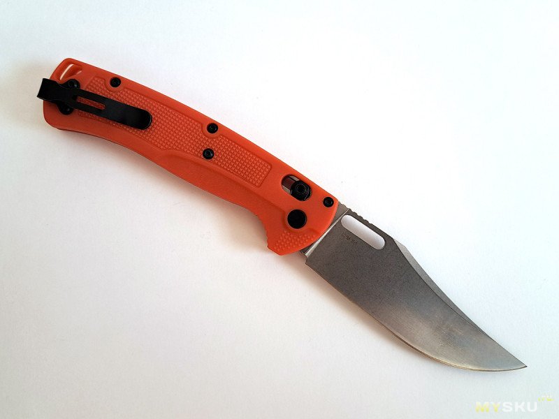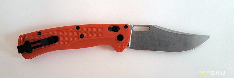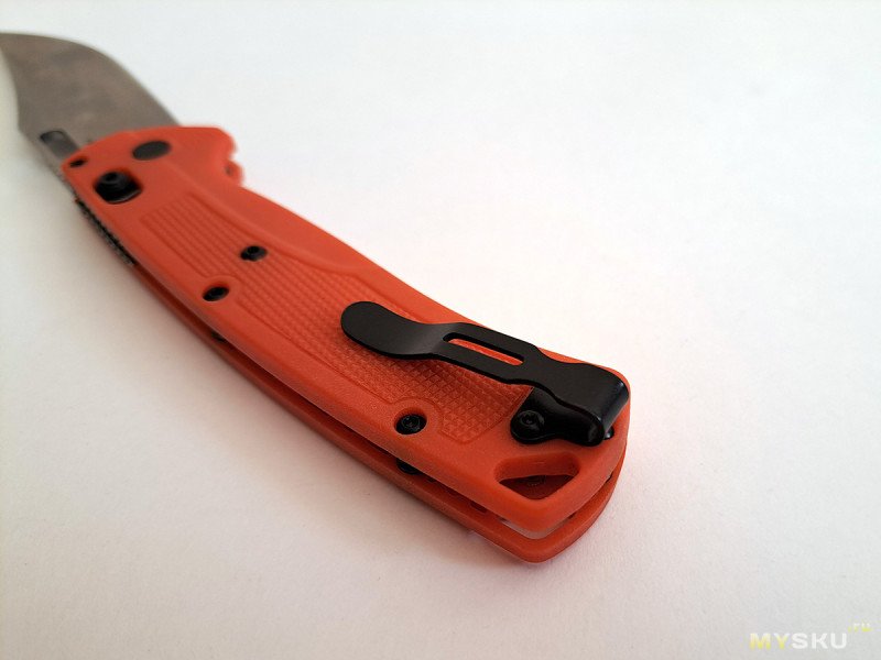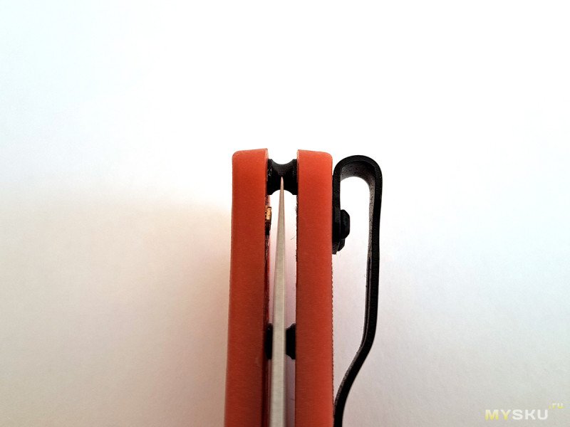 Клипса черная матовая, для глубокой посадки на карман. Хотя, в случае с оранжевой рукоятью, смысла в этом мало.
