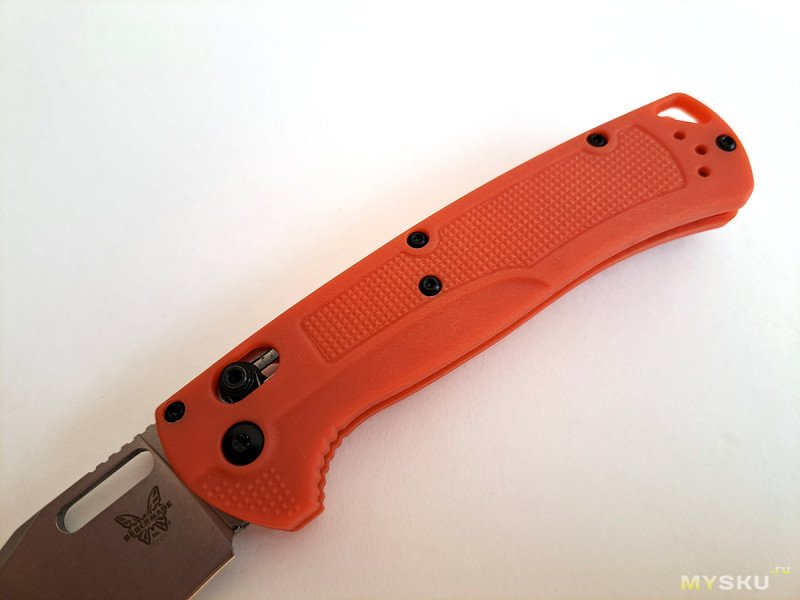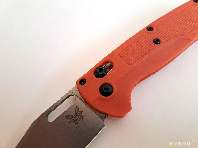 Клинок фиксируется замком Аксис Лок. Рукоять облегчённая, стальные вставки есть только в районе замка. Ножи с таким замком, я без надобности не разбираю, пытался рассмотреть — клинок на шайбах или подшипниках (китайцы могут засунуть). Видно жёлтый металл, но без подробностей.