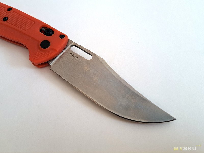 На правой стороне клинка нанесена на маркировка дорогой порошковой стали CPM-154, никакого отношения к данному ножу не имеющая.