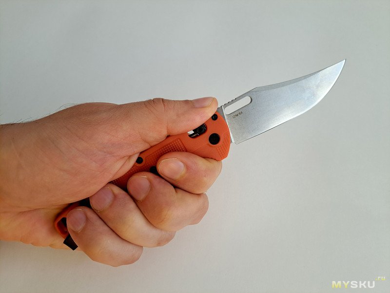 Рукоять заполняет ладонь, но при длительной работе не очень удобная. Клипса впивается в ладонь, насечки довольно агрессивные.