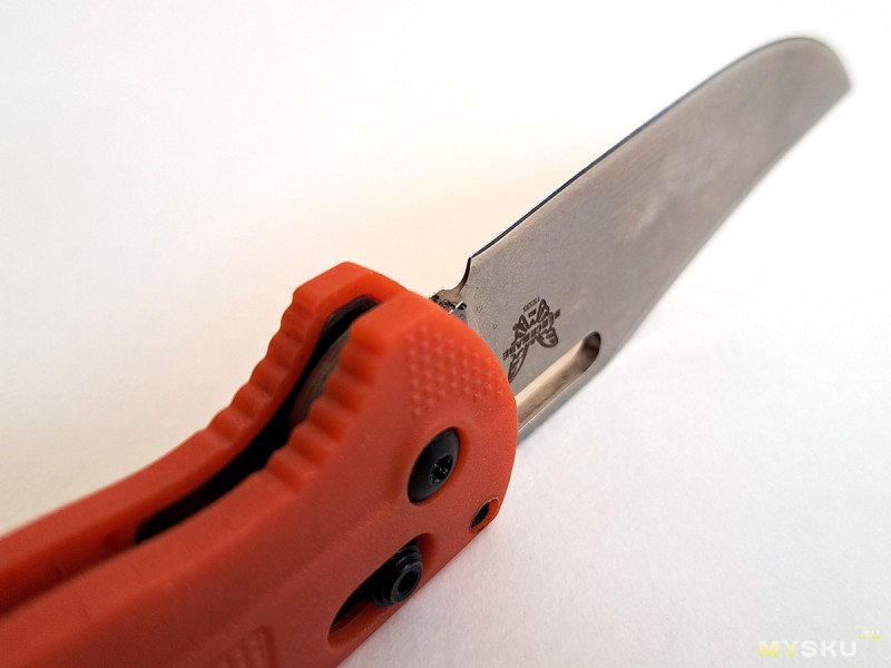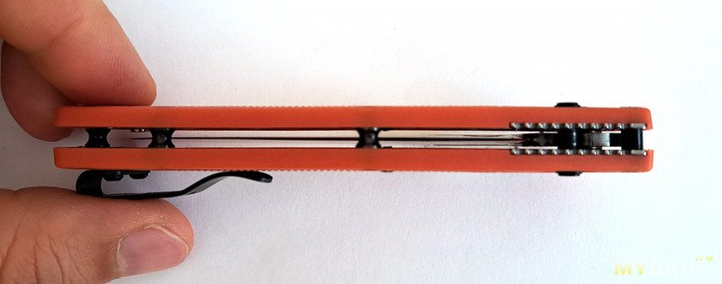 Разблокировать замок одним пальцем у меня не получатся, пружина тугая. У нового ножа механика была не идеальная. Сейчас притерся (похоже внутри шайбы) и клинок падает под собственным весом при снятии блокировки.