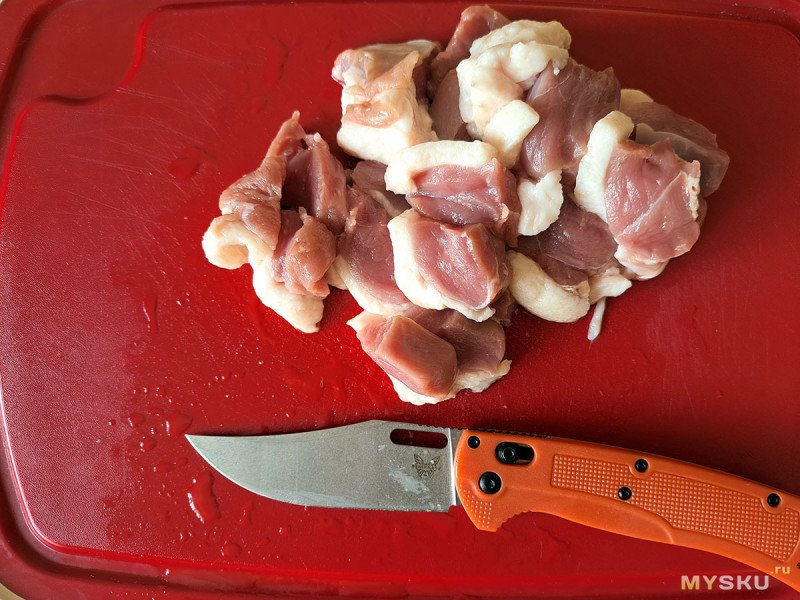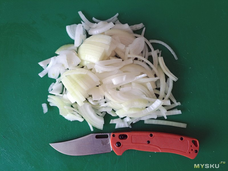 Нарезать эти продукты можно любым ножом, и конечно, лучше кухонным. Но мне интересно как ведет себя нож в работе. И тут я выяснил, что хотя он кажется резаком, на самом деле таковым не является. То есть режет, но как-то неохотно. Ножами от Спайдерко: Милитари и Парамилитари, мне очень нравится нарезать продукты — агрессивный рез, отличная управляемость, а тут такого нет.