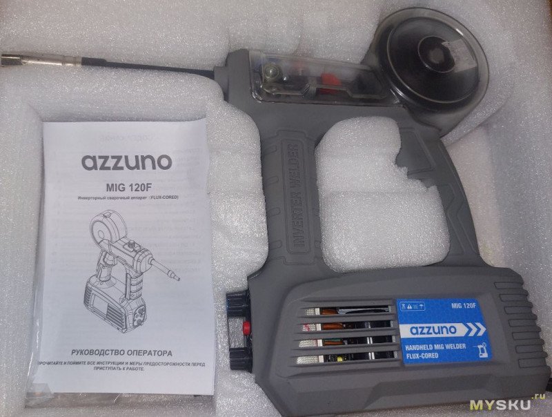 Подробная инструкция на русском языке, в которой расписаны все режимы работы и подробные неисправности.Azzuno MIG-120F — это «сварочный инструмент для дома и дачи». Он не подходит для профессионального производства или сварки ответственных конструкций. Это отличный выбор для тех, кому нужно раз в год подварить забор, петли на воротах или глушитель автомобиля без необходимости возить с собой тяжелые баллоны.