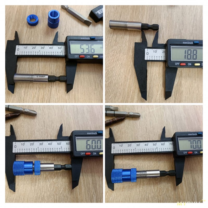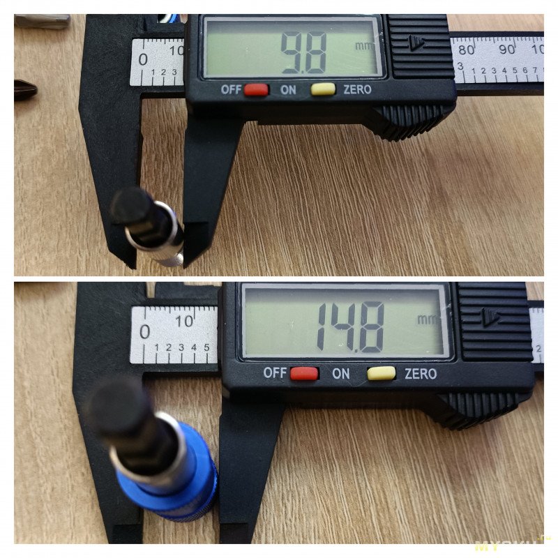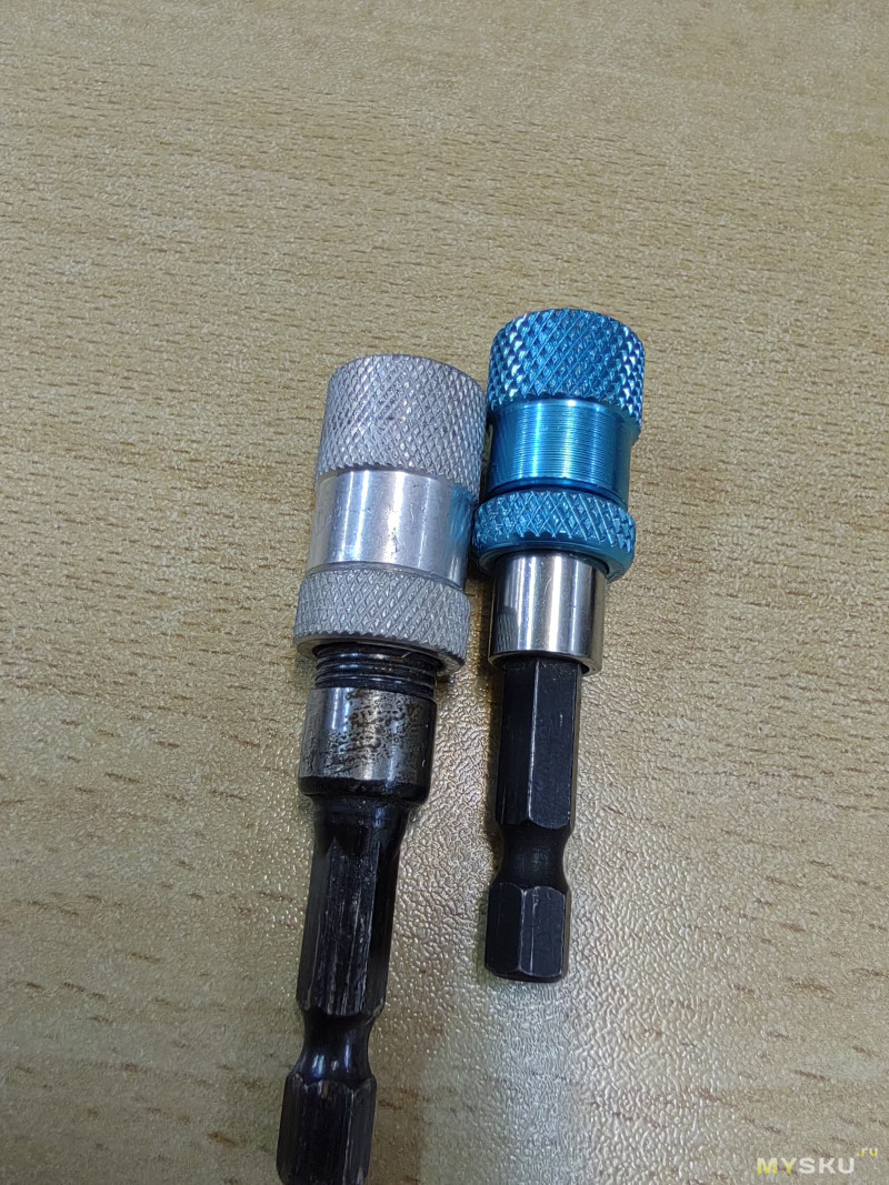 Внешн похожи, а пришли чуть разные хвостовики. Один литой и накручивается сверху магнитная часть, второй составной, часть куда вставляется бита — напресована на 6 гранник.