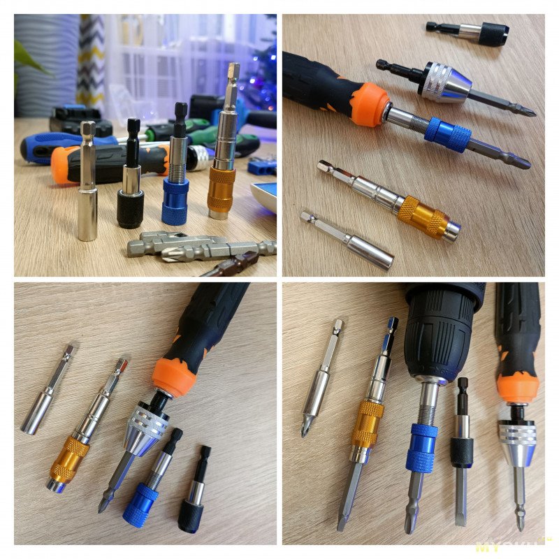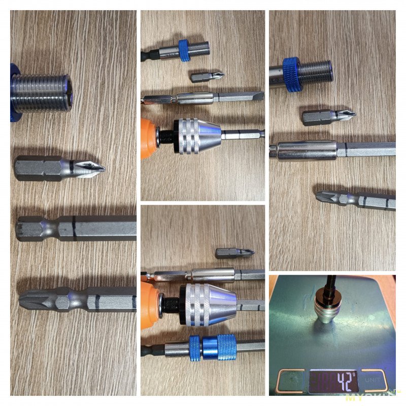 Использую с шуруповёртом, для быстрой смены удлинённых, двусторонних бит и режущего инструмента. С этим вещица справляется хорошо: держит надёжно, люфт минимальный.