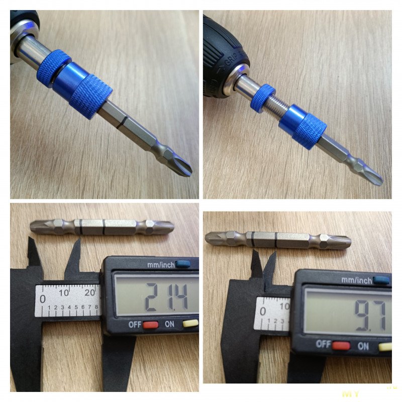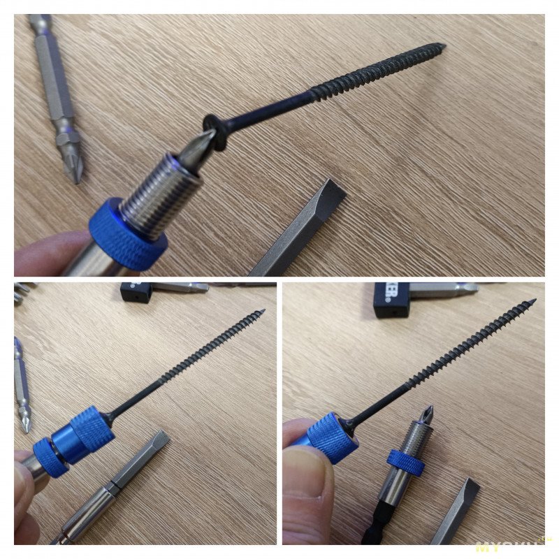 В отличие от обычных держателей бита уходит глубже минимум на 5 мм. даже без насадки. Поэтому люфты/биения ниже, удержание надёжнее — очень хорошо для удлинённых бит. С накрученной «головой» это ещё +5-10 мм. — полезно для двусторонних.