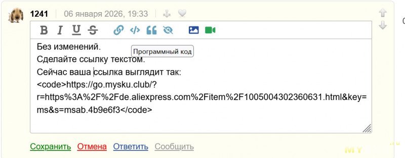 Выберите ответить/вставить программный код/в него вставляйте ссылку прямо с Али.