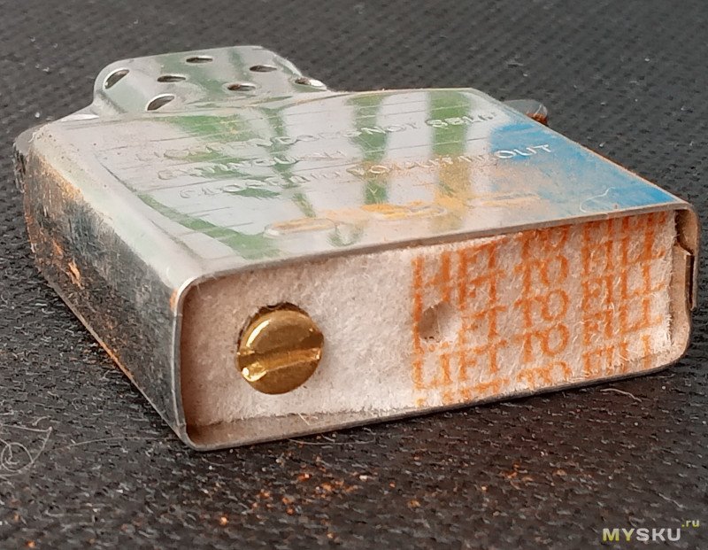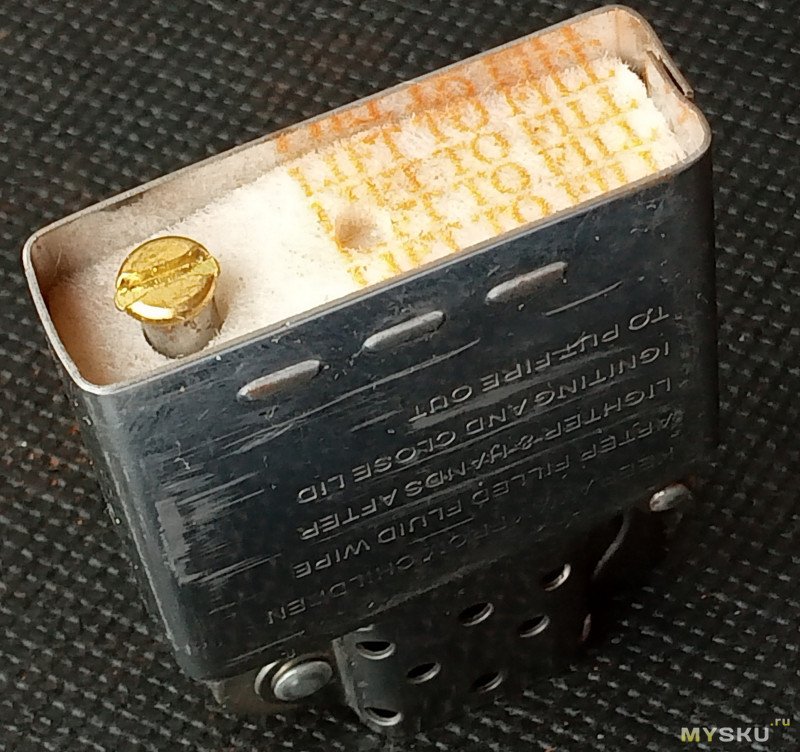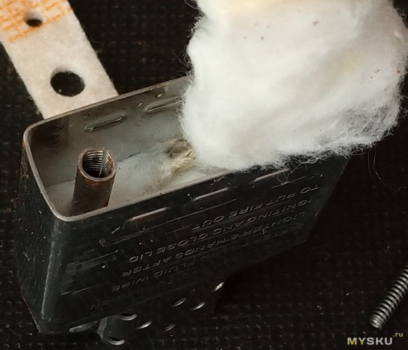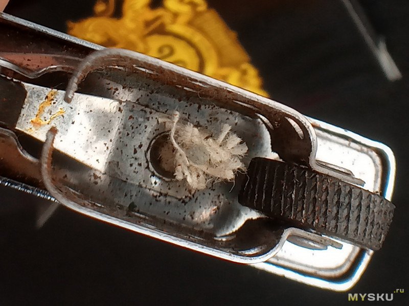 Вата (внезапно, я такое в дешевых зажигалках не видел, обычно напихано не пойми что, не пойми как) уложена тремя «шариками», видно ещё канал для кремня катаный: