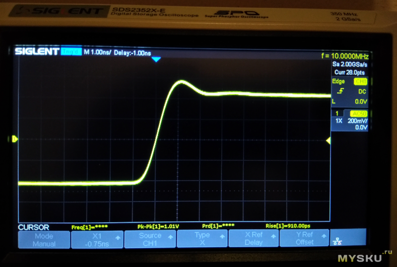 6. У вас 1.25 GSa/s на экране — это 1.2 точки на 1ns. Вам осцил физически не сможет показать сигнал 1ns. Но быстрый сигнал нужен именно для оценки полосы пропускания осцила