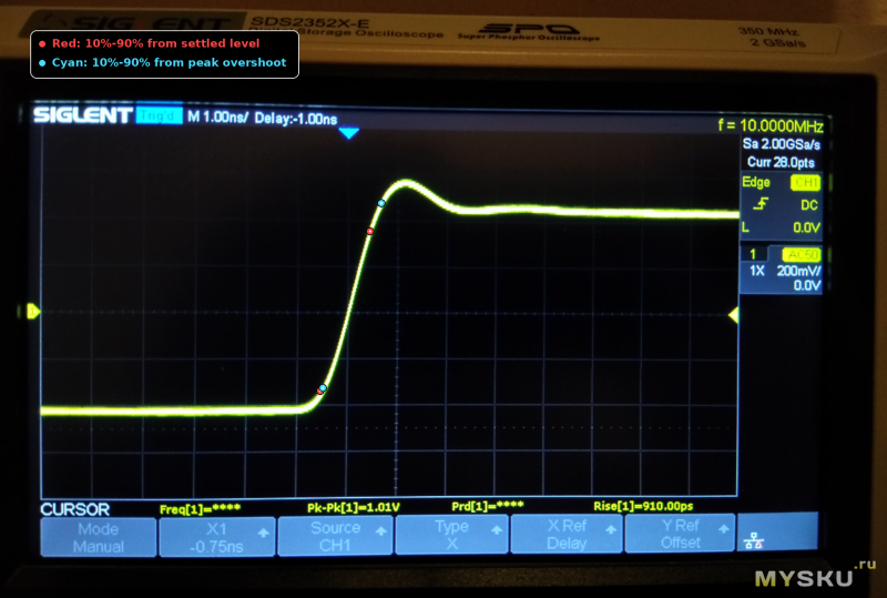 7. Если очень грубо оценить по вашей картинке — нижняя полка AY 0% = 0В (без учета офсета, он не нужен сейчас). BY 100% — после выброса сигнал стабилизируется где-то на 1.45v. 10-90 у вас будет 145mv — 1.3v. По картинке dT грубо 3.4-3.6ns dT (шаг 2ns/div). То есть по картинке 0.35/(3.4*10-9). Т.е. <103Mhz полоса по -3dB. Возможно может и лучше — неидеальность щупа, неидеальность генератора