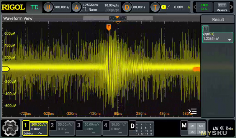 Уже веселее. Максимальное значение «пик-то-пик» в районе 2 милливольта. Щуп исправно изображает антенну.
