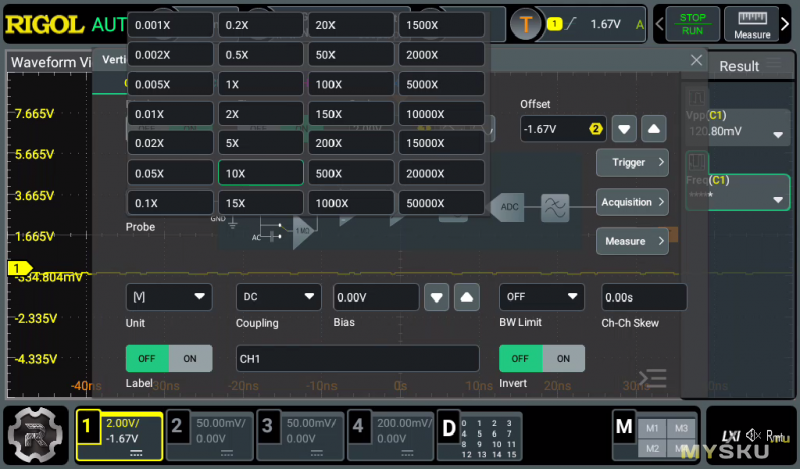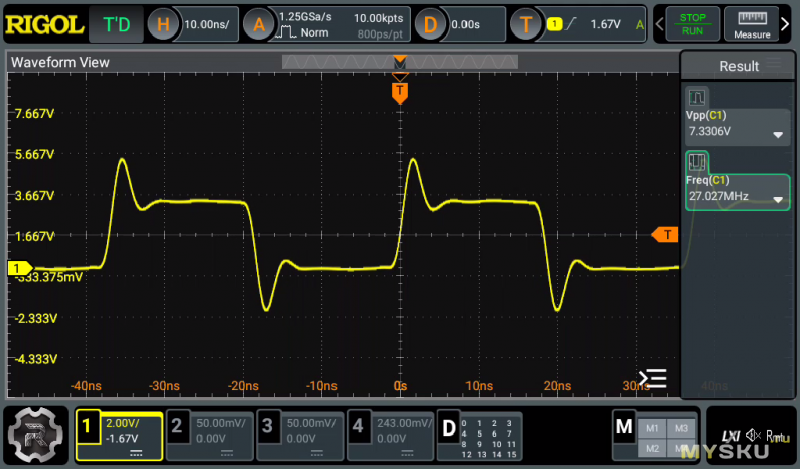 Обращаю внимание, что у осциллографа нет режима с 50 Ом на входах. В принципе мне не критично. У меня есть для этого занятная штука: