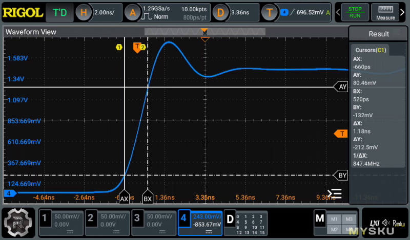А потом попробуем оценить динамические характеристики по входу. В качестве калибратора выступил UTG932E. Его выход синхронизации имеет фронт около 1 nS на нагрузке 50 Ом.