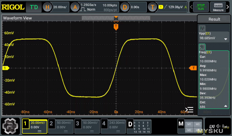 Ну и ради интереса посмотрим сигналы с генератора. Образцового метрологического оборудования дома нет, так что особой ценности с метрологической точки зрения они не представляют. Просто осциллограммы для примерной оценки.