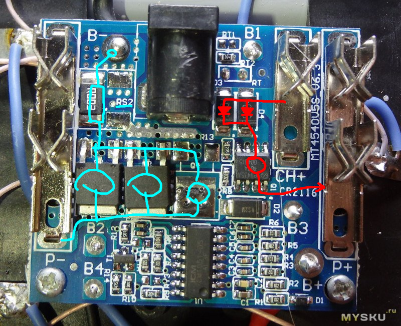 Режим заряда Вход CH+ далее диоды D3 D4 транзистор Q1 и + батареи. При возникновении проблемы перегрев или перезаряд транзистор Q1 закроется цепь разорвётся и заряд прекратиться.