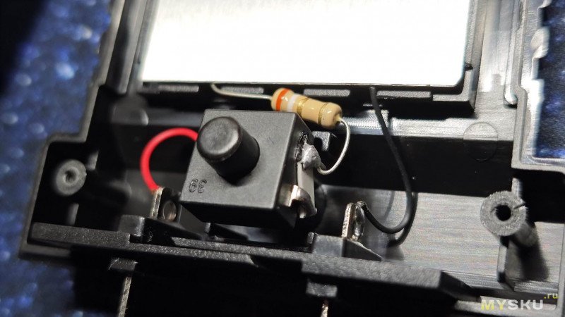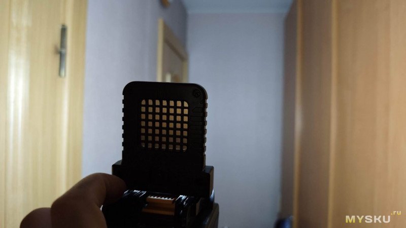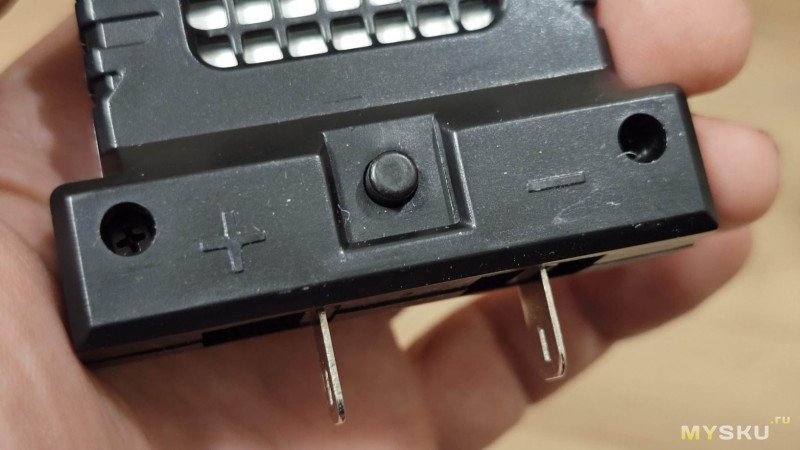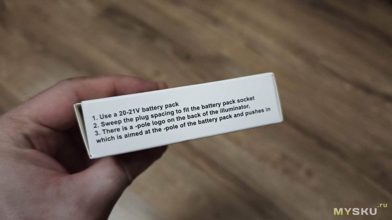 Собственно подключение фонарика сводится к тому, что ножки контакты нужно раздвинуть на ширину прорезей ответных контактов аккумулятора и с небольшим усилием задвинуть их вглубь. Главное не перепутать полярность. На коробке пишут, что в случае ошибки фонарик выйдет из строя.